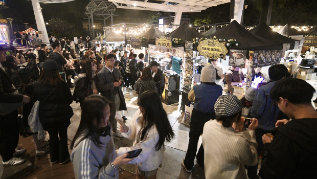 备受欢迎的赤柱圣诞市集,越夜越缤纷,售卖首饰、宠物零食、水晶灯饰、啤酒等店铺前人流不断。有韩国游客花费数百元购买手作耳环,将“made in Hong Kong ”带回家。