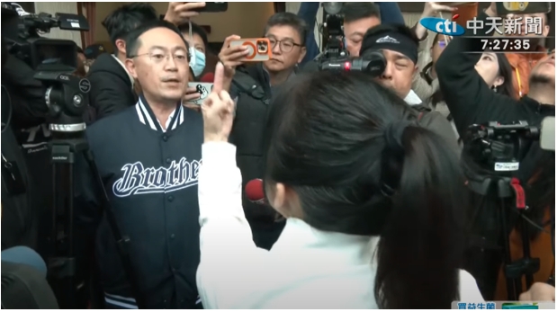 徐巧芯更呛,“民进党楼上就是锁记者,不用再讲了啦”;李坤城则回击,“你们才是小偷、诈骗,都是在国民党”。当听到李坤城说“讲到诈骗就心虚就回头了!”徐则怒比中指回应。李坤城还说,“有没有看到她比什么”;徐巧芯气到指着李坤城痛骂,“比你中指啦,垃圾党,只会敲破窗户的垃圾小人,李坤城你就是他X垃圾小人”。