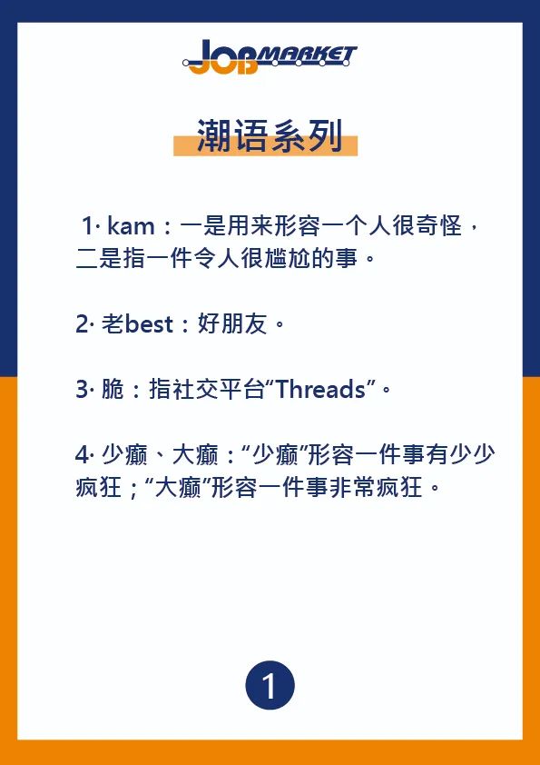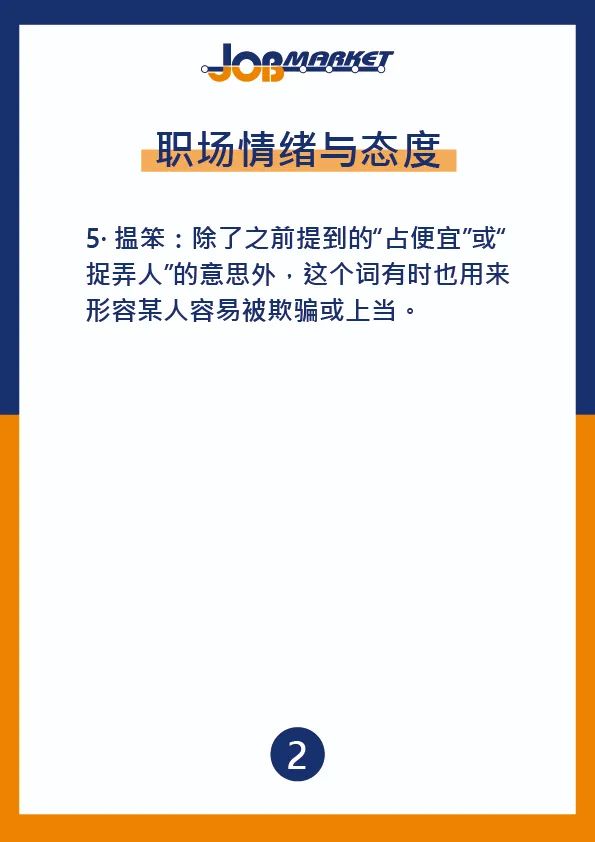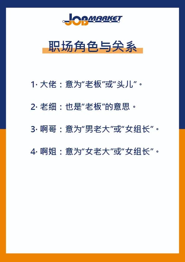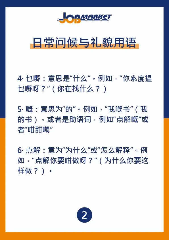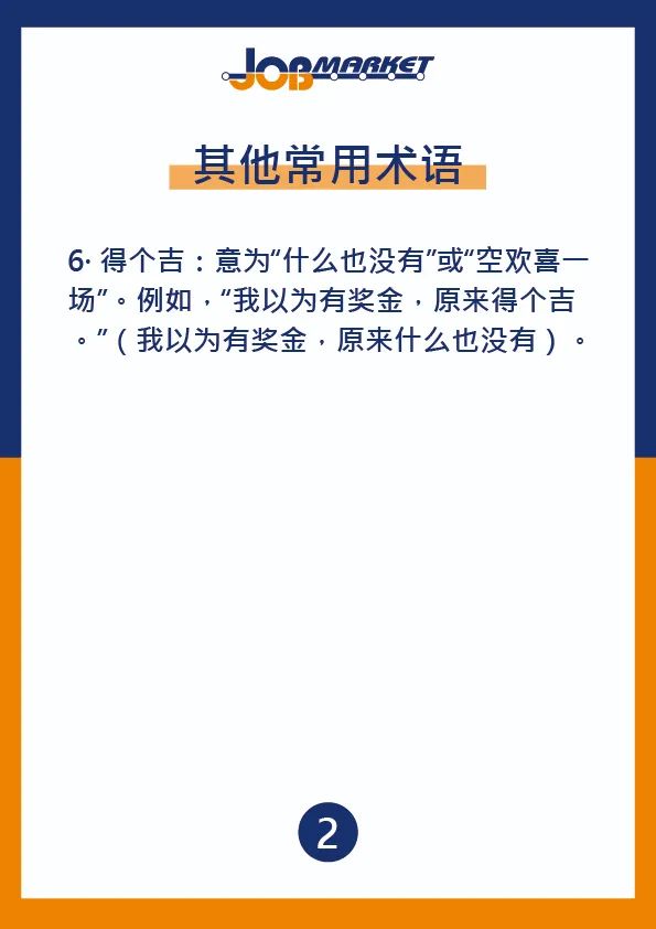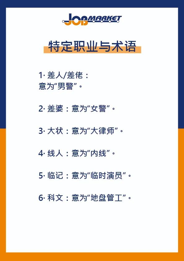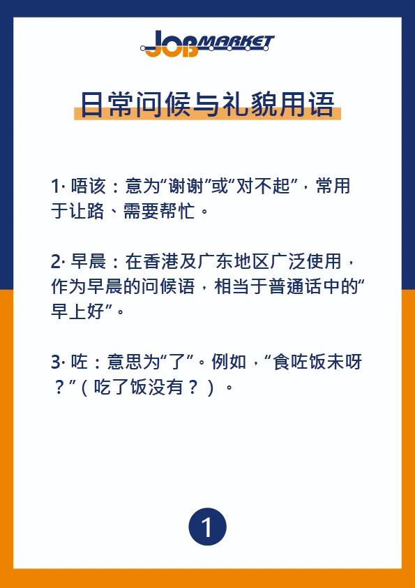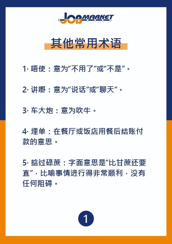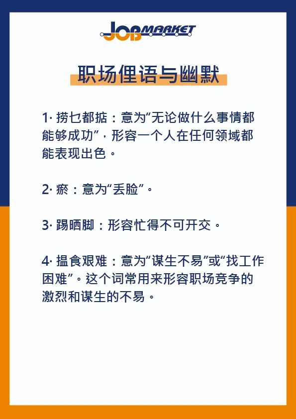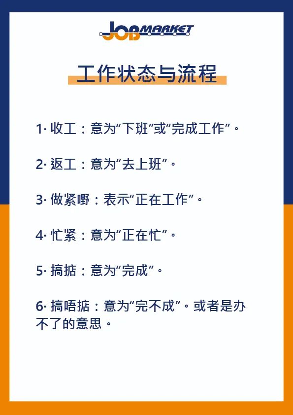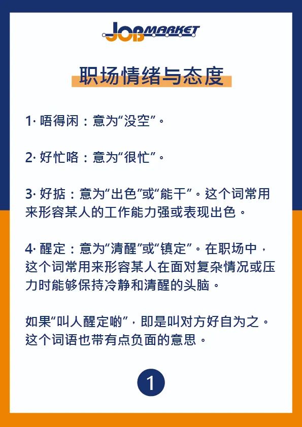 首页>星岛升学就业>香港就业 港式职场经典粤语术语全解析!! 发布时间:2024-12-24 13:48 在香港,粤语是日常交流的主要语言,其中的术语体现了香港人务实、高效、幽默的工作态度。以下图片是JM小君给大家整理的术语,一起来瞅瞅香港职场中都有哪些港言港语? 来源:香港JobMarket 专题 更多 > 中芯国际上半年营收预计超22亿美元,四季度将试产7nm工艺 太兴盈喜料多赚逾3倍,指将坚守审慎理财政策 中国移动半年多赚5%,中期息增近6% 清华女学霸创业、一年一融资,镁佳股份估值9.3亿美元冲刺港交所 应收账款走高,丰沃股份三成收入打“白条” 惠科股份IPO:获政府补助超53亿,向实控人堂弟采购超8亿 关税战|白宫:特朗普签行政命令,对华关税暂缓期再延长90日 高盛:64%关税成本由美企“买单”,消费者仅承担22% 美媒:特朗普政府通过关税施压,要求买美国军火 热门文章 美国美女教师激战11岁男学生,私生子长相揭发惊人真相 妹子遭“黄痰、鼻涕”抹下体超崩溃,男友只喊这句话 大罢免朱立伦竟出这高招,郭正亮曝结局:民进党至少倒5个 新疆女生长相神似“张曼玉”爆红,本人羞回:做梦都会笑醒 习近平特朗普通电话,称愿推动中美关系在新起点上取得更大进展 奇闻秘史︱清朝22岁最后武状元,凭“执生”赢光绪欢心霍元甲都认输 特朗普1月20日上任美国总统,就职典礼8大重点率先看 你是否赞成台湾执行死刑?最新网络民调太震撼网友一面倒 蔡壁如选民众党主席有赢面?媒体揭3动机博声量最大化 看到柯建铭近日举动,沈富雄示警:没有处理是空前大危机