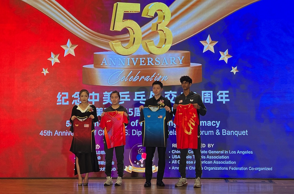 纪念中美“乒乓外交”53周年、中美建交45周年论坛暨晚宴22日在美国洛杉矶举行。乒乓球世界冠军马龙和刘诗雯等专程赴洛杉矶与会。在现场和美国乒协代表进行交流和互动。他们身着西装组成混双组合大展球技。