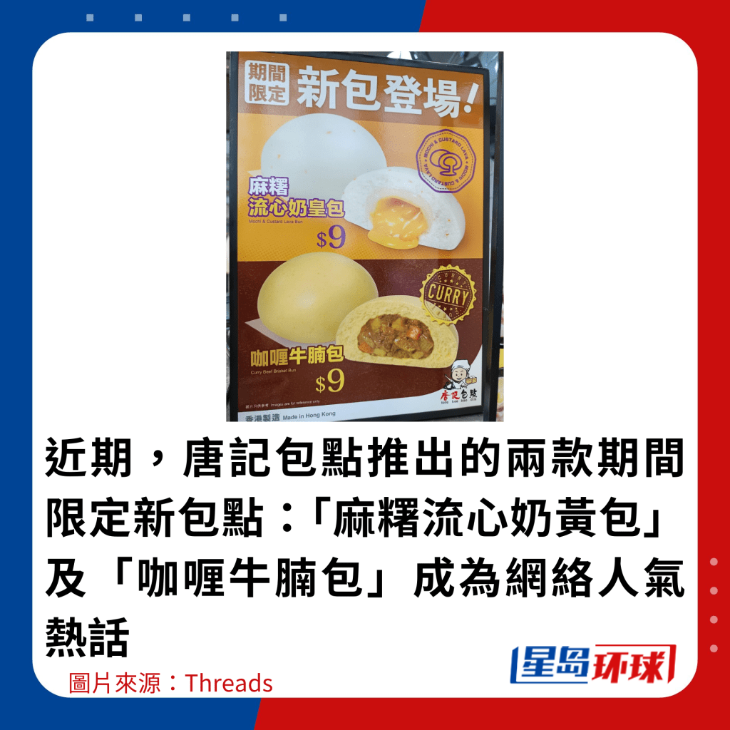 近期,唐记包点推出两款期间限定新包点,分别是“麻薯流心奶黄包”及“咖喱牛腩包”,售价$9/个,一推出随即引起网民追捧,各间分店不时售罄,所以想尝试的市民记得要早点去买!