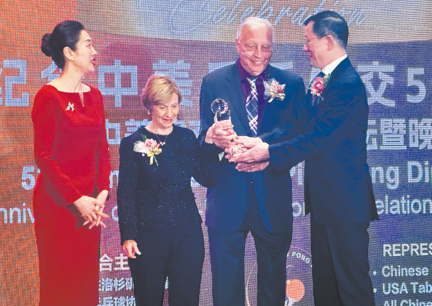 ▲郭少春(右)、王薇(左)为美国国家队前队员“乒乓外交”见证者颁奖。记者陆新摄