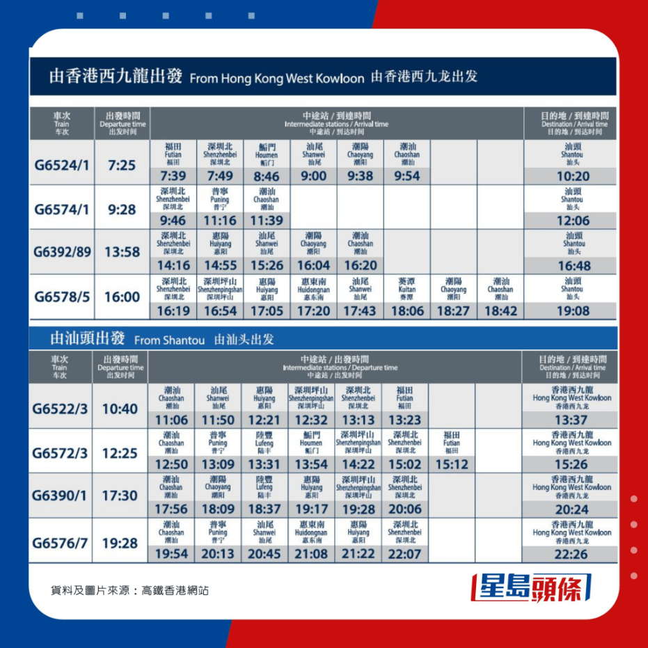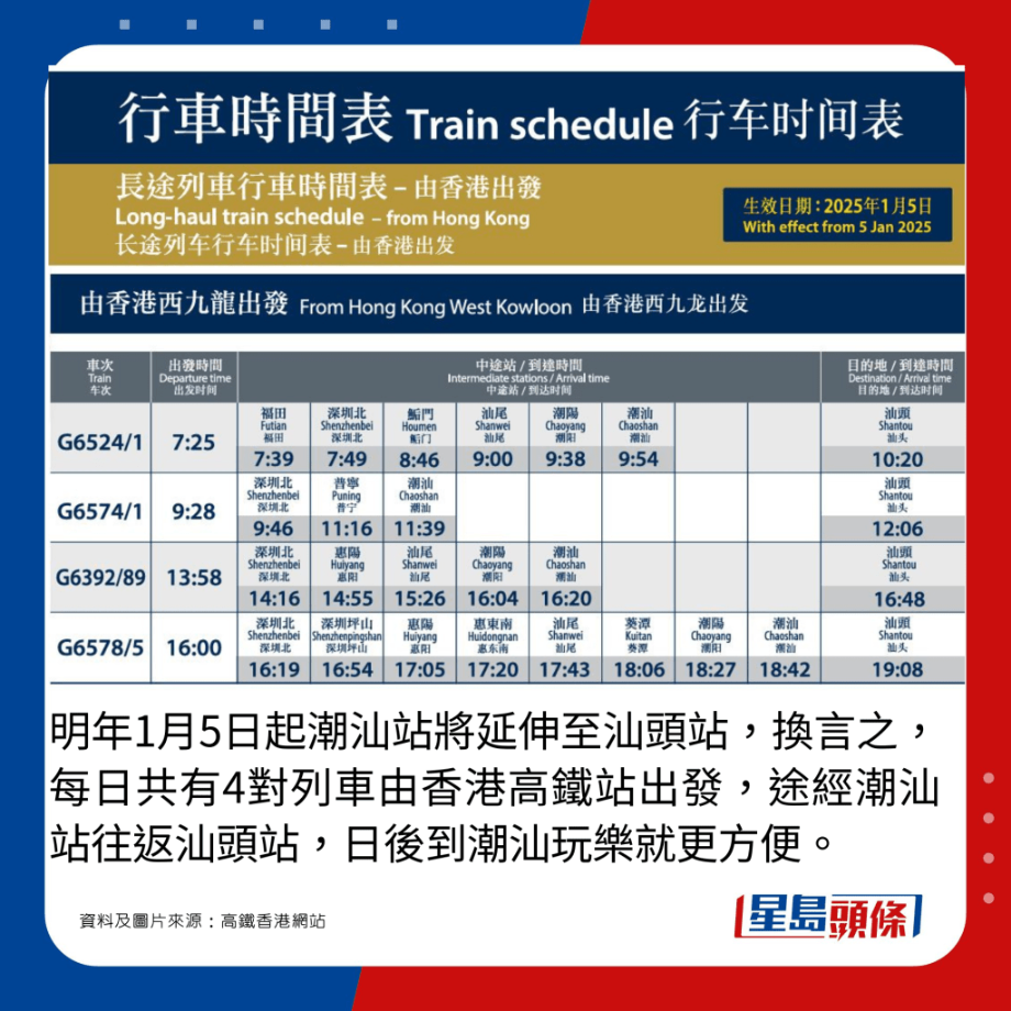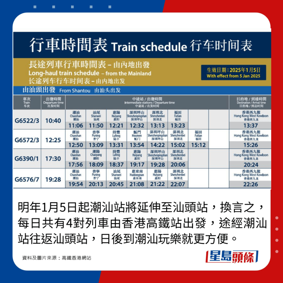 据高铁香港网站资料显示,由于新塘乃牛仔服饰产业龙头,加上近年积极转型,以持续拓展新机遇,所以由高铁香港站来往广州东站的站点中,亦将会增设早晚各一对列车加停新塘站。值得留意的,明年1月5日起潮汕站将延伸至汕头站,换言之,每日共有4对列车由香港高铁站出发,途经潮汕站往返汕头站,日后到潮州及汕头玩乐就更方便。点击图辑看各站点的班次及时间。