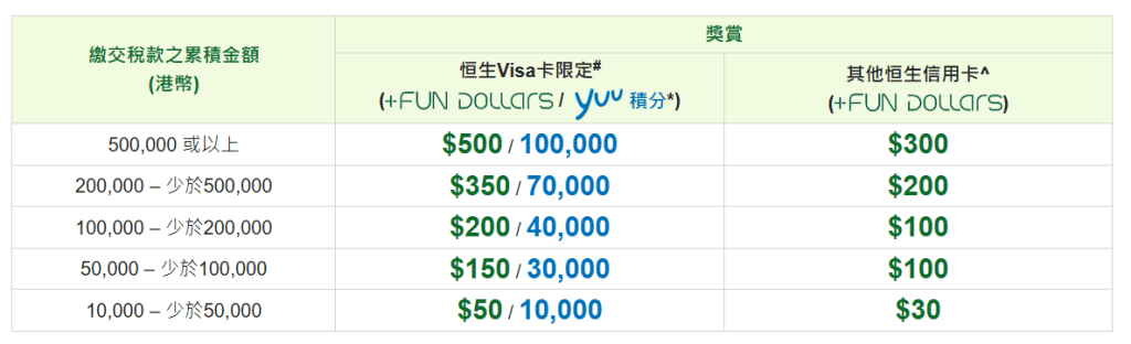 恒生信用卡用户于网上缴费服务累积交税满指定金额,最高可享高达500元+FUN Dollars或10万yuu积分,但要留意客户需先作登记。推广期至明年2月28日,具体累积交税金额要求及奖赏见下图: