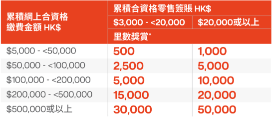 此外,网上缴费新客户推广期内累积合资格零售签账满3,000元及网上合资格缴费金额满5,000元,可赚额外2,000里(由20,000奖分转换)。