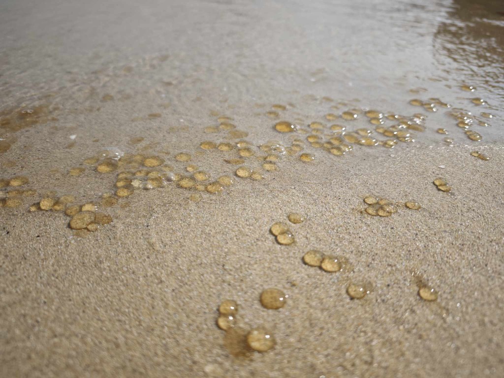 不少网民大胆估计,猜测这些透明“水珠”是“油污”、“好奇想知.如果是油污,沙不会吸油吗?”、“水母”、“水母B B?”、“金钱水母?”、“贝壳类既卵”、“螺嘅卵?”,甚至是“Omega-3(脂肪酸)”。