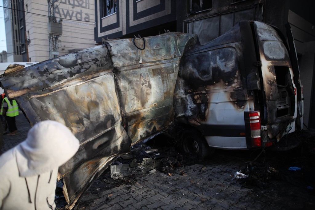 ▲1枚导弹击中停放在努赛赖特奥达医院外的采访车。新华社