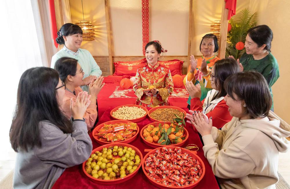“夹年生”是婚礼的准备阶段,包括选定合适的年份进行婚礼筹备;“拿茶叶”环节通常涉及双方家庭通过媒人交换茶叶等礼物,作为婚事的初步确认;“择日”是根据双方的生辰八字和家族传统,选择一个吉利的日期进行婚礼;“使日”是确定婚礼当天及前后几天的具体安排,包括各项礼仪和活动的顺序;“起厨”则是在婚礼当天,开始准备宴席,邀请亲朋好友共聚一堂;“坐高堂”意为新娘和新郎在婚礼现场的高堂上接受亲友的祝福;“上头”是新娘和新郎在婚礼前进行的一种传统仪式,象征着他们即将步入婚姻的殿堂;“嫁仪”是新娘在出嫁前进行的一系列仪式,包括梳头、祭龙王、松头等,同时会唱“叹家姐”,这是沙田民歌最原始的曲调;“花船迎亲”是新娘乘坐装饰华丽的花船,在亲友的陪同下前往新郎家;“渡水饭”为新娘到达新郎家后,双方家庭会在水上举行一场盛宴,庆祝这一重要时刻;“拜堂”是新娘和新郎在堂屋内向祖先和长辈行礼,表示对他们的尊敬和感激;“闹洞房”是婚礼结束后,亲友们会在新房内举行一系列的游戏和活动,以增添喜庆气氛;“回门”是婚后第三天,新娘和新郎会一起回到新娘家,探望父母和亲友。