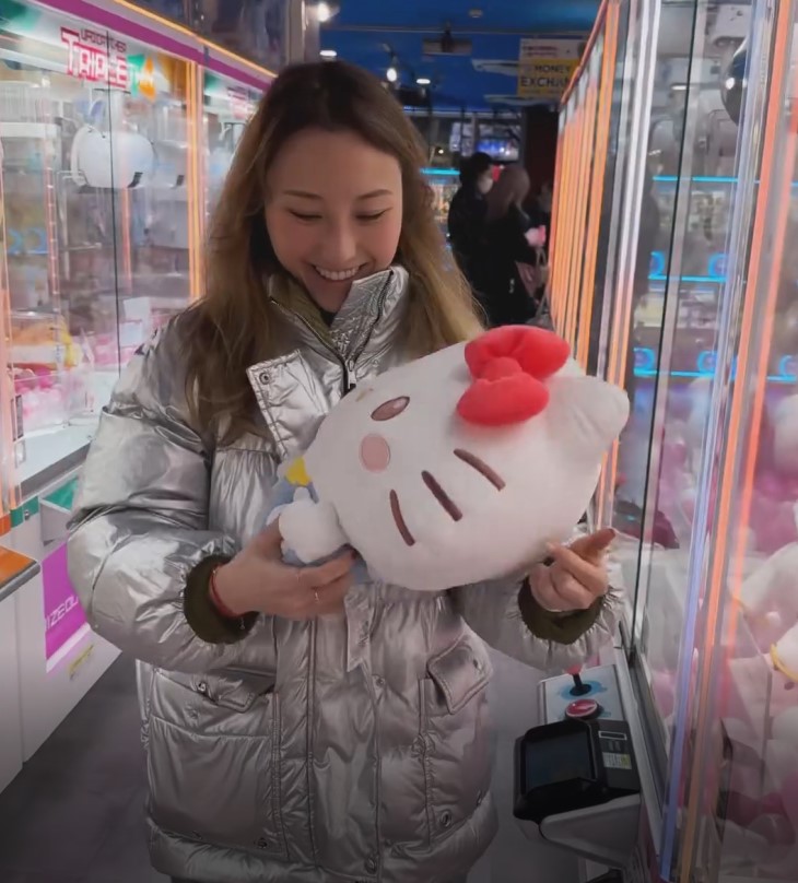 何超云昨日(26日)更新IG,写上Happy X'mas'来记录今次开心之旅。 因为日本天气寒冷,何超云于户外穿上卡其色羽绒大衣并头戴同色画家帽,轻抚吊在树上的圣诞波波装饰,露出甜到漏的笑容,明显揸机拍照的是Douglas。 之后二人闲逛人山人海的市集,并去到挟公仔店游玩,从片中所见,何超云从挟公仔机中抽出一只巨大Hello Kitty公仔,并拥在怀笑不拢嘴,未知是否由Douglas挟得。