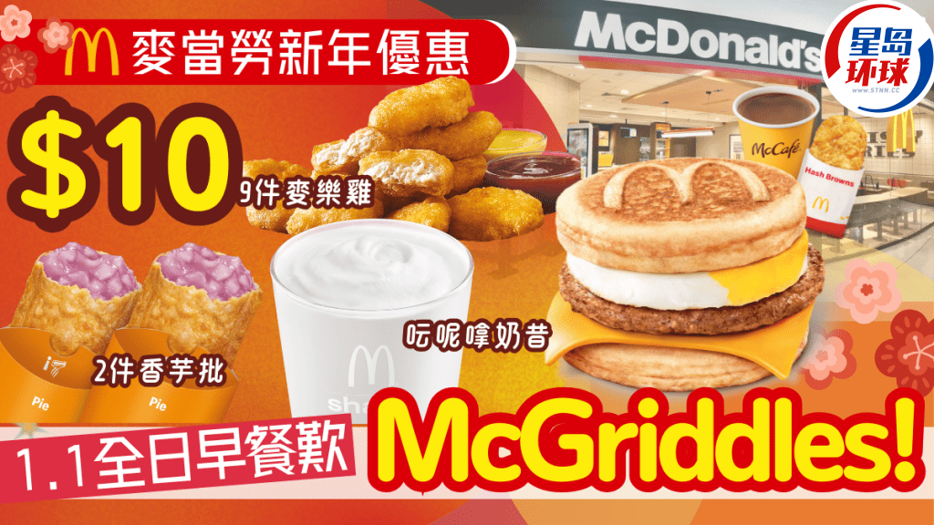踏入2025年麦当劳McDonald's会推出多个惊喜优惠! 头炮有1月1日元旦当日全日供应早餐,包括人气McGriddles系列及珍宝套餐等。 而由1月2日起一连7日,麦当劳App会推出“麦麦 celebrate”活动,每日有不同优惠,包括$10九件麦乐鸡、$10呍呢嗱奶昔及$10两件香芋批等,即睇以下内文麦当劳新年优惠详情!