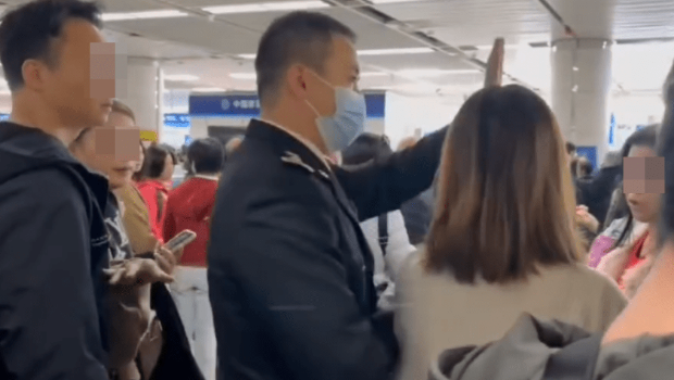 ▲两批港人在内地过关时起冲突。图片:网上影片截图