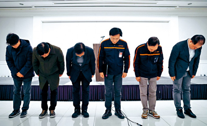 ▲济州航空行政总裁金利培(右三)与一众高层周日为空难鞠躬道歉。