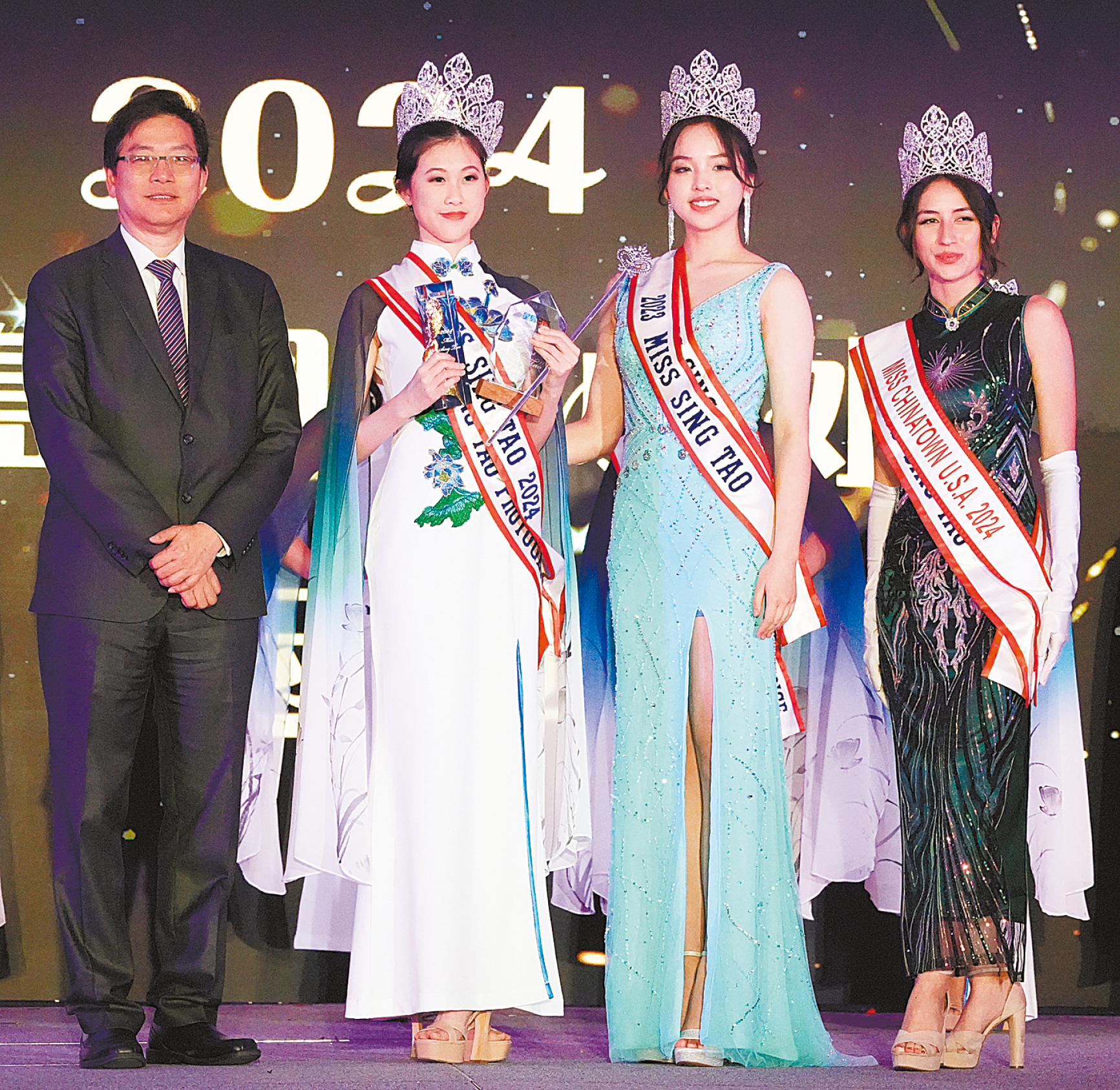 ▲徐伊一(左二)摘得“2024年星岛亲善小姐”桂冠,星岛日报美西版社长梁建锋(左一)、2018年星岛亲善小姐冠军及2024年全美华埠小姐冠军黄美华(右一)、2023年星岛亲善小姐冠军游洛伊(右二)为她颁奖。记者黄伟江摄