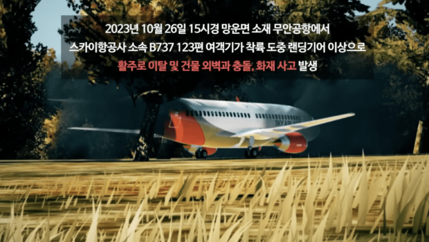 该段防灾演习片由韩国政府行政安全部在2023年底制作,主要针对全罗南道务安郡空难救灾训练,从影片可见,模拟灾难事故设定为2023年10月26日下午3时,一辆波音737编号123客机在务安国际机场降落途中,起落架突然发生故障,无法顺利降落,迫降时偏离跑道,随后撞上建筑物外墙,引发火灾。