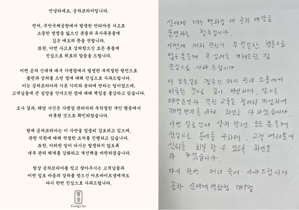 ▲韩国贡茶周一(30日)急忙在官网发出公司声明,更附上加盟店主管的手写信致歉。