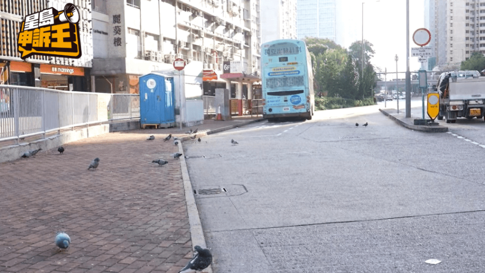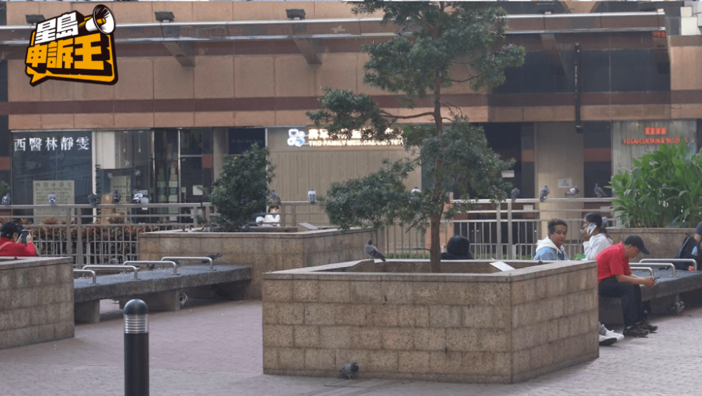 ▲天后留仙街临时休憩处的野鸽分散在周围,未见有人喂饲野鸽。