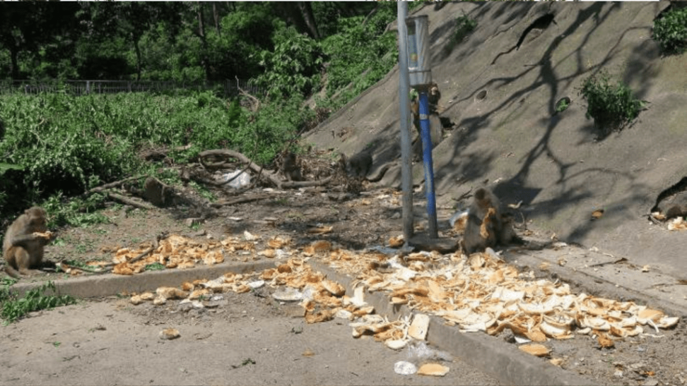 ▲琵琶山段停车场以前不时有人驾车,将食物倒在地上喂猴子。(受访者提供)