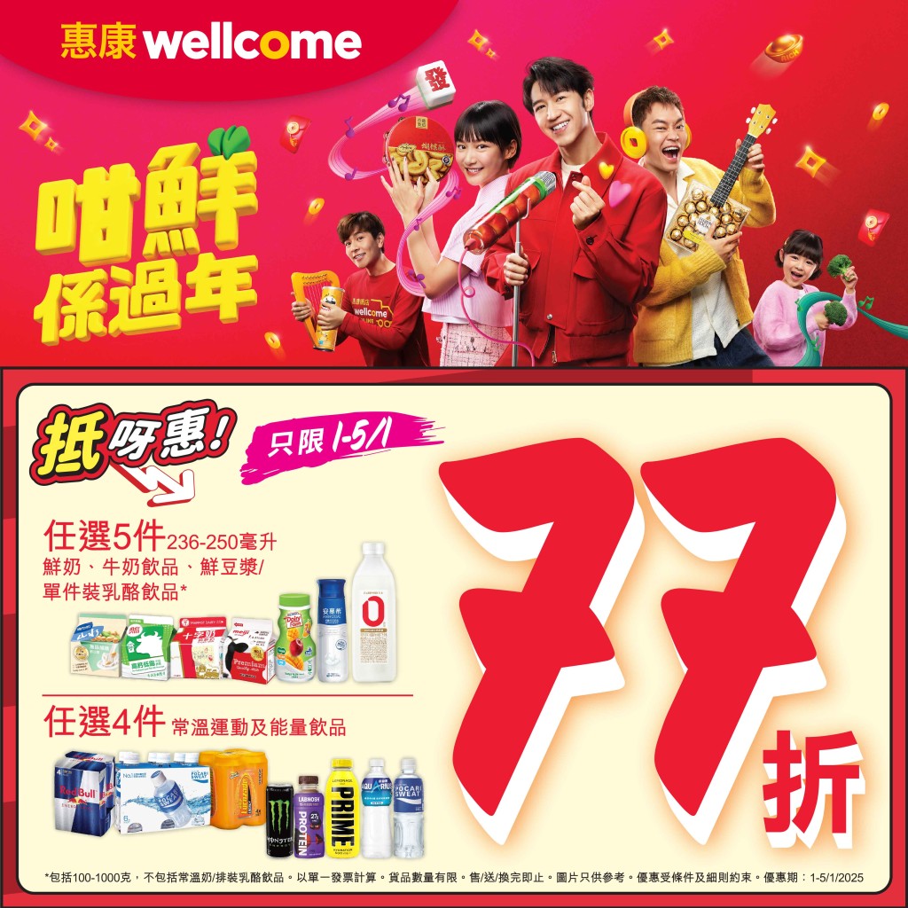 小朋友早餐必备鲜奶、豆浆,惠康就特别于2025年1月1日至5日^,推出快闪优惠,凡于惠康购买指定5件豆类及奶类饮品(包括鲜奶*/牛奶饮品*/鲜豆浆*/单件装乳酪饮品#),即可享77折优惠!另外,购买任何4件常温运动及能量饮品,亦可享77折,让大家于新一年充满能量! 同步亦有多款人气酒品折扣优惠,如Asahi 朝日啤酒、K1664白啤酒、奔富红酒等,让大家可于佳节畅饮!妈妈还要留意金象牌顶上茉莉香米和维达4D立体压花卫生纸,均以激抵优惠价发售!