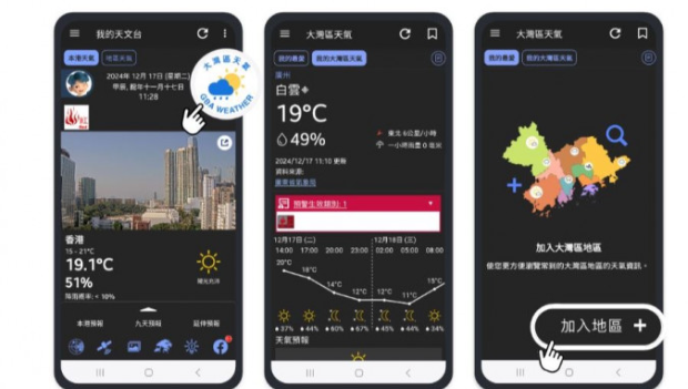 天文台表示,为便利穿梭大湾区的市民,天文台推出了“我的天文台”APP新版本,除本港天气信息之外,新增了大湾区天气信息,让市民在“我的天文台”上可以轻松查询大湾区其余10个城市50多个地区的实时天气观测,生效警告和预报资料。透过定位功能,市民更可以随时获取身处大湾区所在地区的最新天气情况,为日常生活和出行计划做好准备。