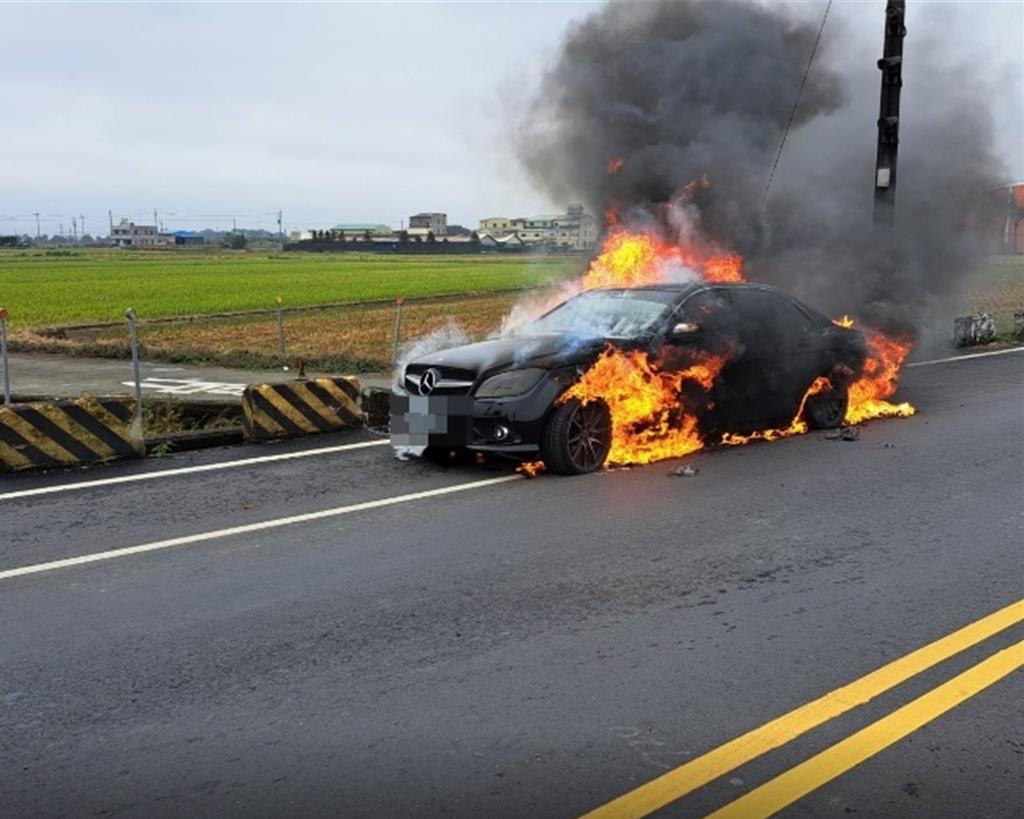 ▲一辆奔驰轿车行驶至后壁区长短树地区时突然冒烟起火,不久即全面燃烧。(民众提供/宝智华台南传真)