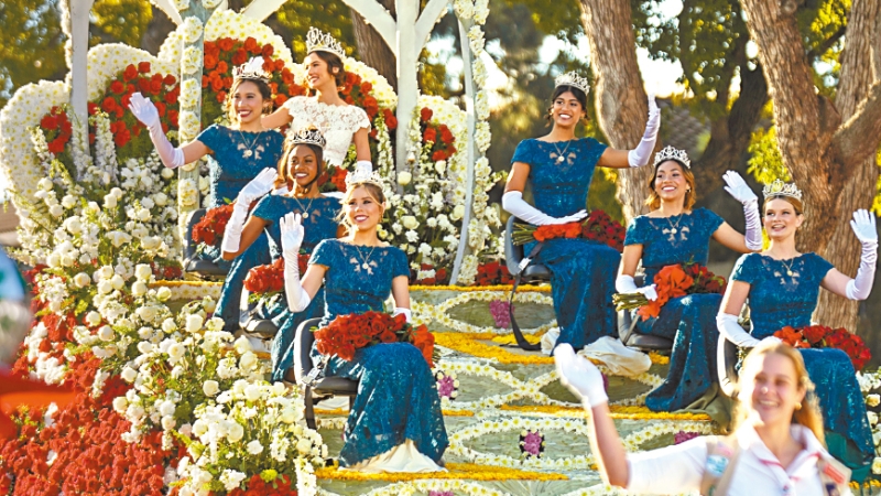 ▲本届选出的玫瑰皇后及玫瑰公主在花车上向现场观众挥手致意。美联社