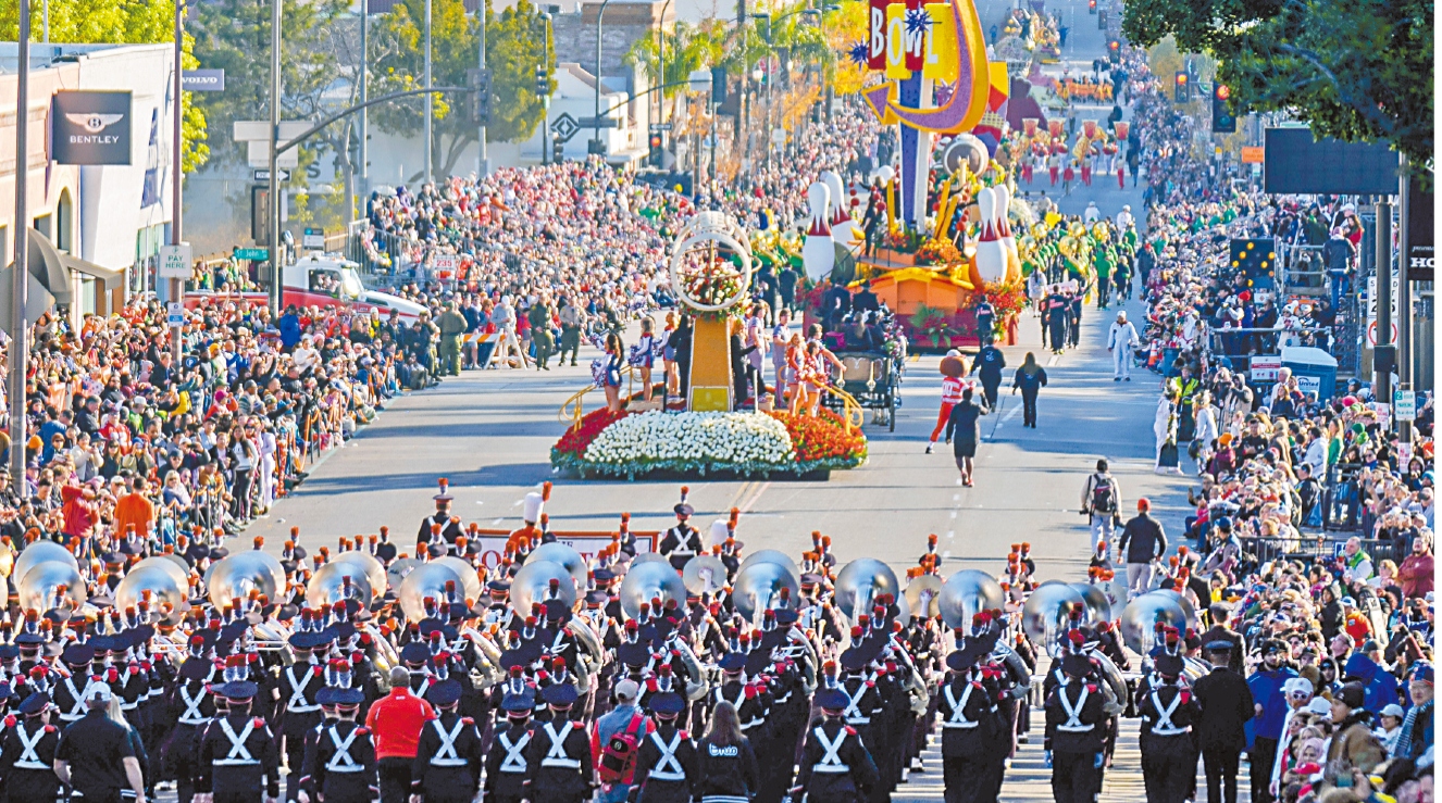 ▲本届玫瑰花车活动于科罗拉多大道上登场,游行乐队在意外的阴影下表演。洛杉矶时报