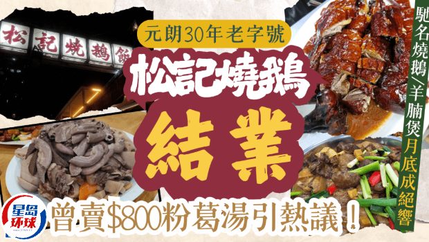 位于元朗凤翔路的松记烧鹅饭店,屹立该区数十年,因秘制烧鹅及羊腩煲等小菜驰名,深得街坊支持,亦有不少区外食客及旅客会专诚慕名到店一试。 不过小店昨日就于 Facebook 专页公布,因租约期满,店铺被业主回收,松记烧鹅饭店即将于1月28日年廿九结束营业。 负责人形容“新嘅一年开始,亦都系另一个时代终结”,并感谢食客历年来对店铺的支持。