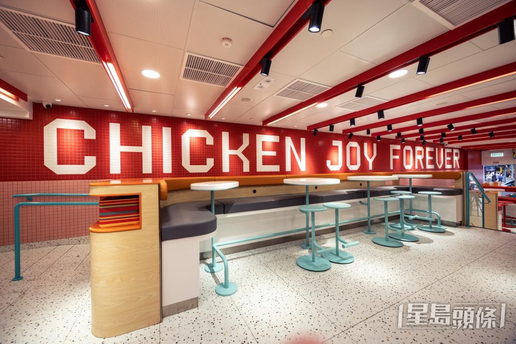 去年,Jollibee翻新了北角英皇道的门店,该概念店的设计理念,源于品牌核心价值——为顾客来快乐,用色和设计上较为活泼,在原有的红色上加上鲜橙、粉绿等颜色,牆身为时下流行的拼花砖牆,不仅注重视觉效果,也设置了多种座位,包括舒适卡座和高身吧枱座位。现场所见,不少座位有提供充电插位,并增添了自助点餐机。