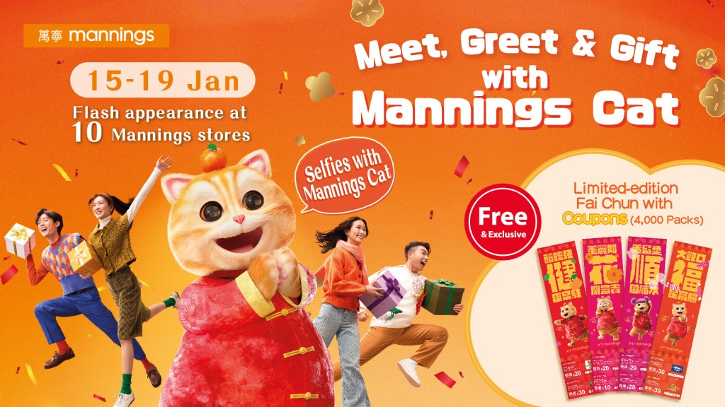 随着2025年农历新年的临近,香港最大型健康及美容产品连锁店万宁,特别推出“万宁猫 送心意 大健事 快闪拜年团”活动,为市民带来一场充满健康与祝福的新春盛宴。此次活动不仅有万宁猫首次以新春造型亮相,还将巡回港九新界多达10间万宁门市,与市民近距离互动,送上限量版挥春及优惠券!