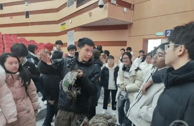 ▲黄彦钧向群众介绍自制酷炫战术装备。