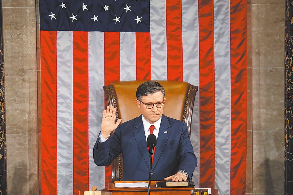 ▲美国众议院3日举行议长选举,共和党籍现任议长约翰逊惊险赢得连任。图为约翰逊宣誓就任议长。(路透)