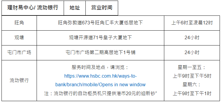 汇丰“迎新钞”20元及50元自动柜员机之服务点: