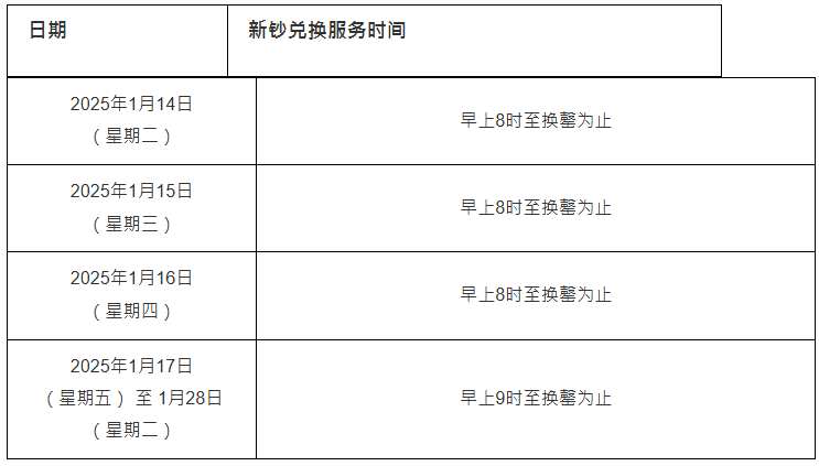 延长营业时间:于提供换钞服务的首三天(1月14日至1月16日),银行分行将提早营业至早上8时,并将上述额外营业时段(即早上8时至9时)专门用作换钞服务。