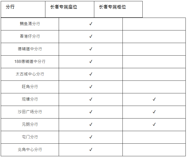 为方便长者兑换新钞及迎新钞,以下渣打分行设有长者专属柜位及座位。
