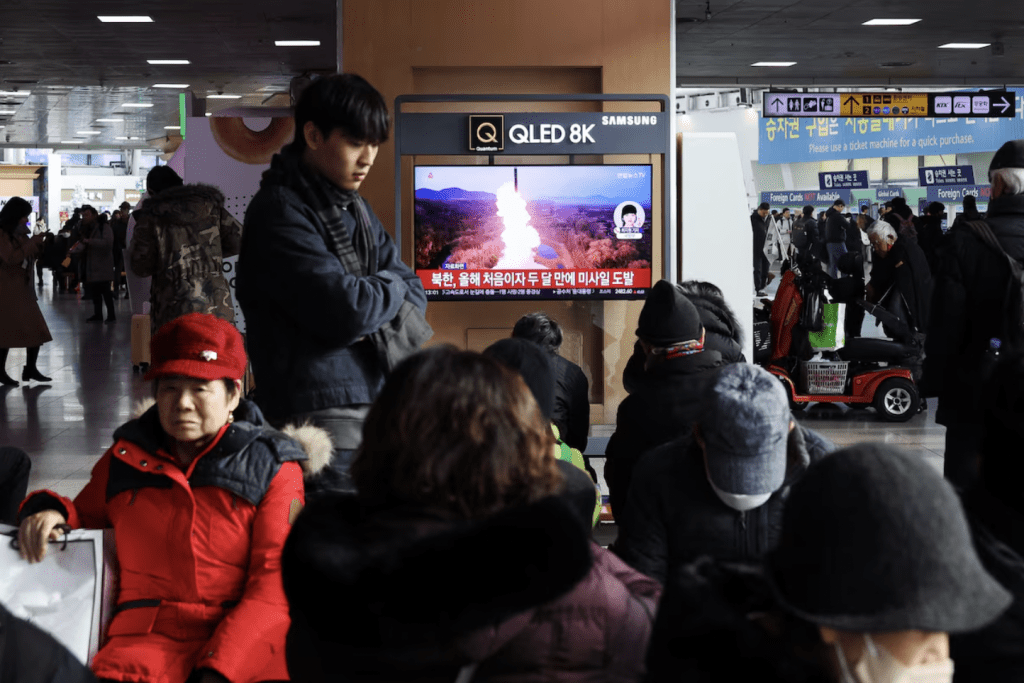 ▲2025年1月6日,韩国首尔,人们观看电视播放有关朝鲜向东海岸发射弹道导弹的新闻报道。路透社