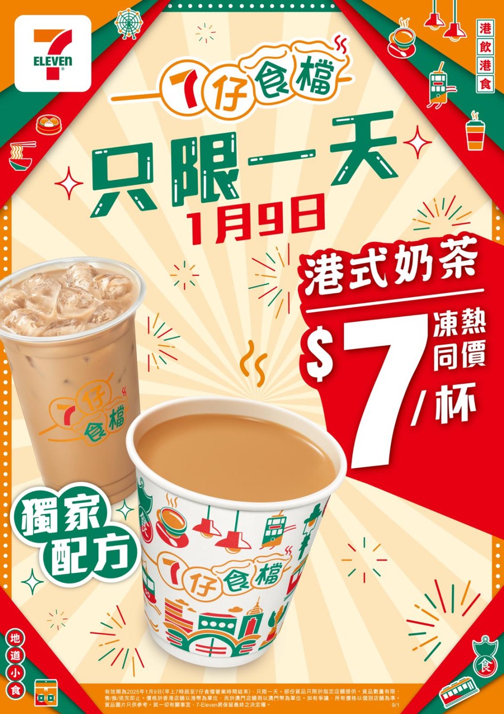 除了小食限时特价外,7-Eleven还推出超值饮品优惠,1月9日当日只需$7即可购买港式奶茶一杯, 热冻同价!奶茶采用独家配方,茶香浓郁,奶味顺滑,每一口都可以感受到最地道的风味。