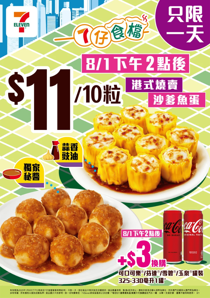 7-11便利店快闪优惠!于1月8日(三)下午2时后到访到“7仔食档”,即可以$11享用10粒港式烧卖或沙爹鱼蛋,搭配全新推出蒜香豉油,为经典小食添上特别风味。此外,只需加额外加$3,便可换购罐装可口可乐、芬达、雪碧或玉泉(325-330毫升)!