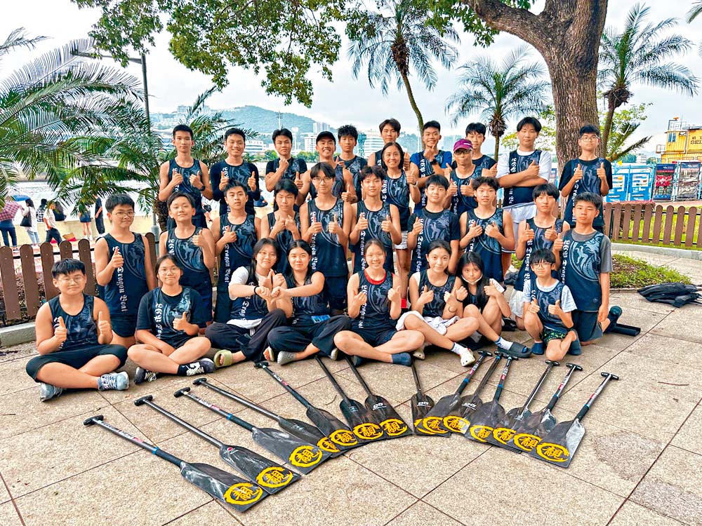 ▲龙舟队队员黄文涛同学(2A)、李咏滔同学(6B)、梁东霖同学(6A)、江泰言同学(2A)、简振义同学(1B)相当享受龙舟队的气氛。