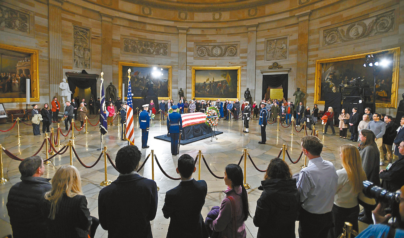 ▲前总统卡特的灵柩7日早上由专机从乔治亚州首府亚特兰大运往马里兰州安德鲁斯空军基地,然后由灵车送到首都国会山庄圆形大厅,供民众瞻仰。 美联社
