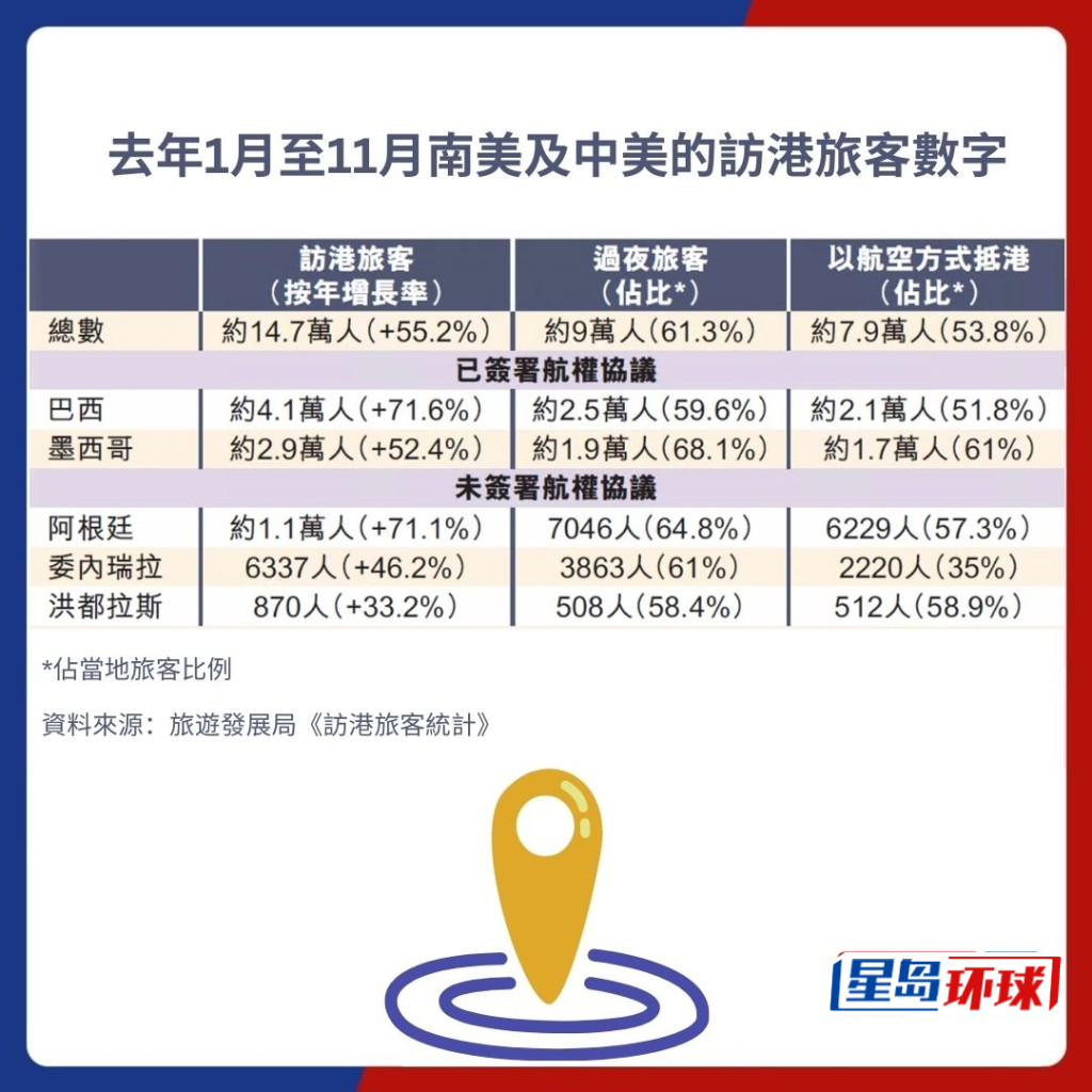 至于未有航权的地方,多为南美洲地区,如阿根廷、委内瑞拉、乌拉圭、智利、玻利维亚及秘鲁。参考旅发局公布最新一份《访港旅客统计》(月刊),2024年1至11月共有约14.7万旅客由南美及中美访港(见表),按年增长率达55%。以阿根廷为例,去年首11个月有约1.1万人访港,按年增长71.1%,当中60%旅客乘搭飞机来港。