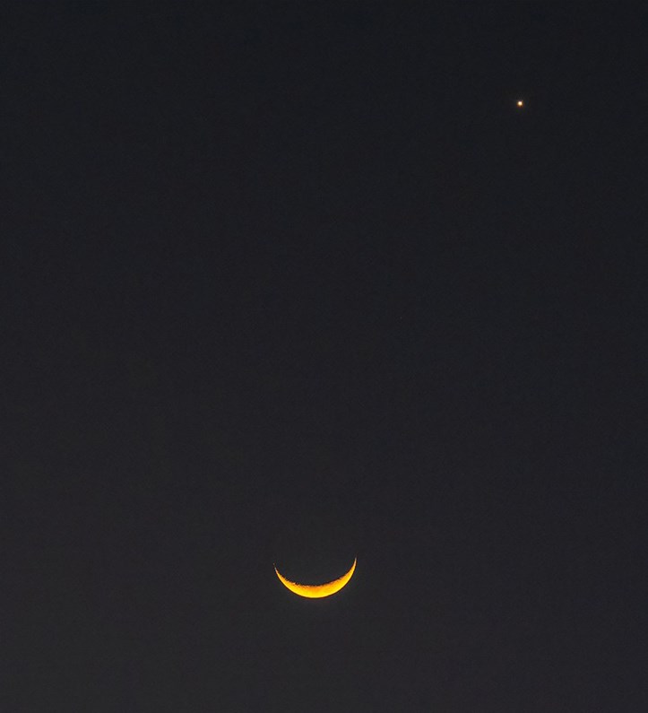 香港连续两周都有特别的天文现象可观赏。天文台日前在facebook以“金星合月”为题上载网民相片,见到汀九桥上挂上的一弯新月,右上角有一点明亮星光,像极了一张正在眨眼微笑的脸。