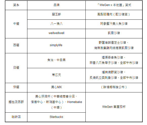 以本地再生农作物入馔的WeGen菜式,将于合作院校和机构的员工或学生饭堂及医院病人餐供应,菜式包括“香煎猪扒饭伴红酒烧汁配烤车厘茄及烩时蔬”、“烟熏脆皮肠拼鸡扒饭伴意式鲜茄汁配烤车厘茄及烩时蔬”及“本地种植车厘茄沙律杯伴柚子油醋汁”。除此之外,多款“WeGen菜式”亦会由即日至4月期间,分别在美心旗下30间指定中、西、日菜餐厅,快餐店、西饼店及咖啡店陆续推出。