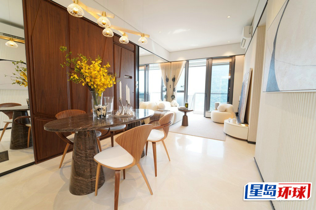 发展商同步开放2B座37楼A室交楼标准示范单位参观,面积915方呎,属3房1套间隔,单位大门入口位置预留空间摆放储物柜,方便收纳,连接长方宽敞客饭厅,间隔方正实用。