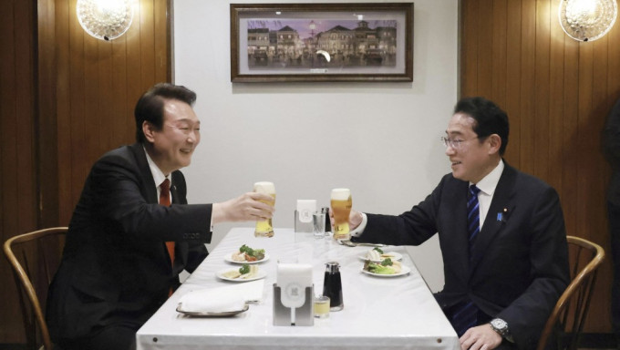 ▲尹锡悦访问日本时,与岸田文雄举杯喝啤酒。 路透社