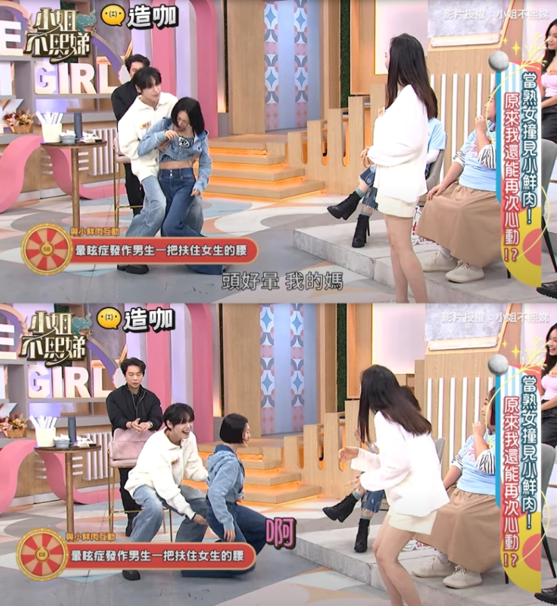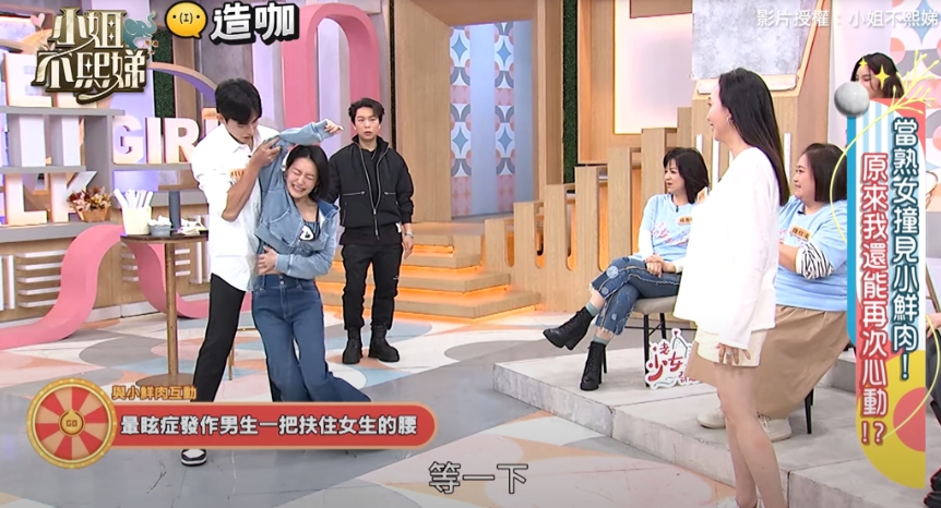 小S选出小鲜肉All in一起上演浪漫桥段,要示范“晕眩症发作,男生一把扶住女生的腰”的帅气动作,怎料,对方却直接拉住小S的手,让她上衣都快被掀起来,小S急忙喊卡、生气表示:“哈囉,你哪行啊,我要的不是这种感觉,OK,你那个扯我的胸部快要露出来了,今天不是我要露胸部,是你们要露胸部,OK?”