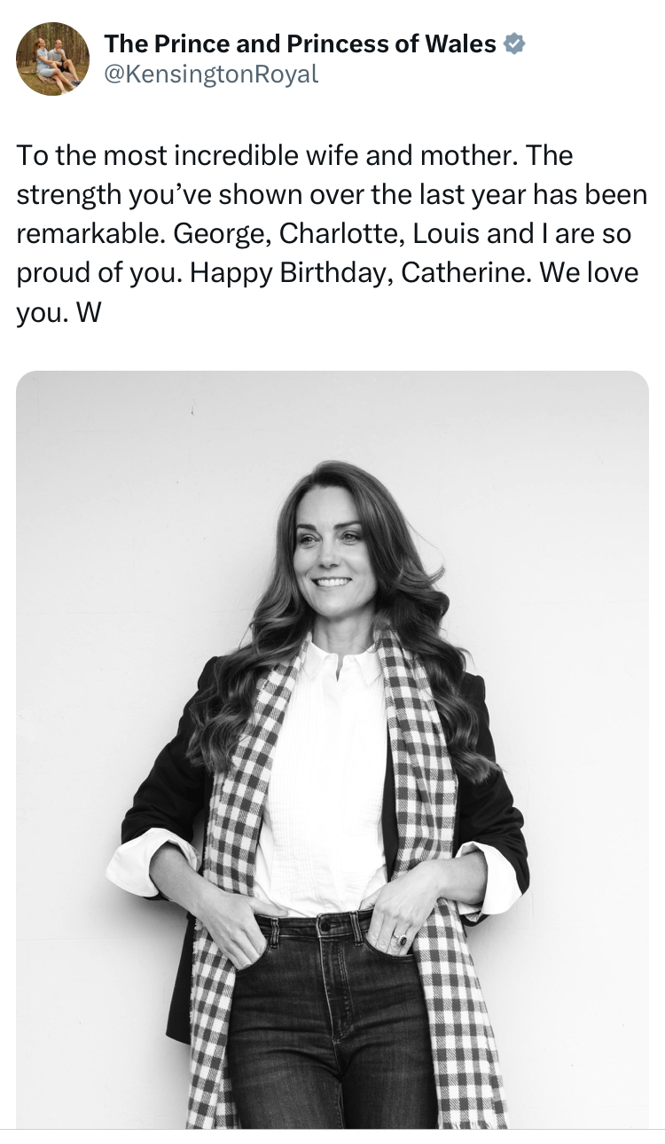 英国威尔斯王妃凯特(Catherine,Princess of Wales)1月9日迎来43岁生日,丈夫威廉王子(Prince William)在社交平台发文庆祝,称赞凯特过去一年,在对抗病魔所展现的力量“非同凡响”。