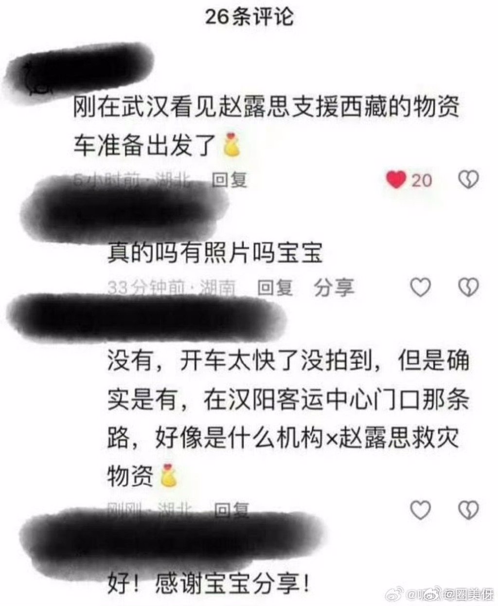网友也发现,有一台红色大货车,上面绑着红布条,写着“赵露思,紧急驰援西藏!”原来,目前正在专心养病的赵露思,把支援的物资,从武汉发车至西藏,低调地替灾区尽一份心力,爱心不落人后。许多网友忍不住盛赞:“赵露思生病了还在做着公益”、“很善良的小女孩”、“赵露思真的是太有爱心了,希望未来越来越好”、“正能量我的女神,支持”、“特别好的小女孩,一直在默默坚持公益,今天如果不是被人偶遇,可能会一直都不知道这件事”。