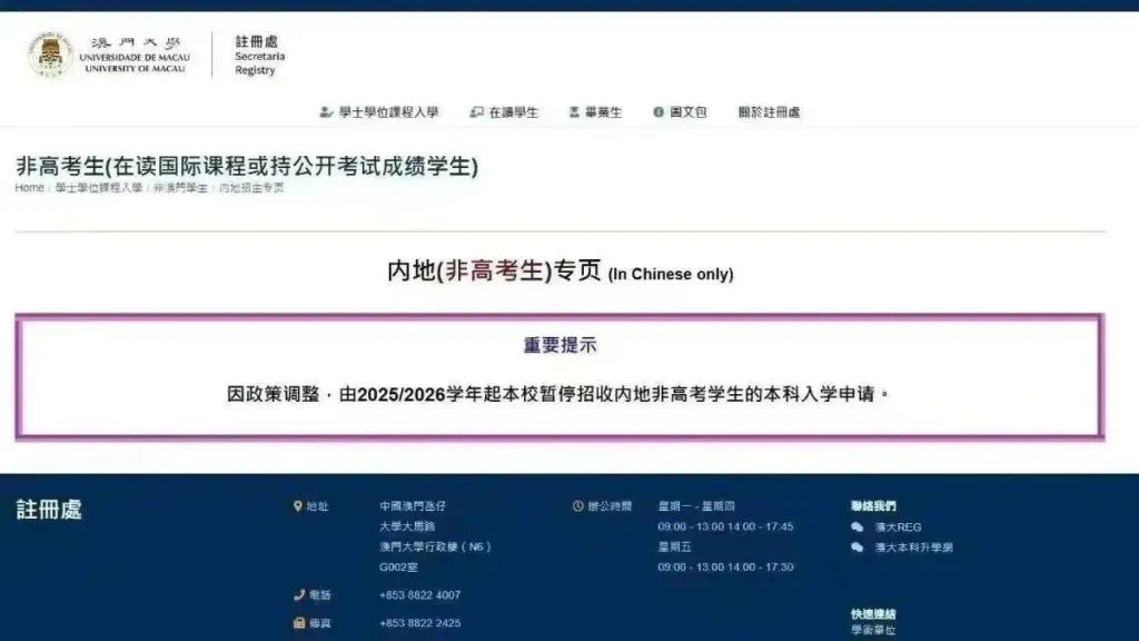 但故事到这并没有结束。继澳大之后,澳门理工大学、澳门科技大学、澳门旅游大学、澳门城市大学这四所院校也纷纷表示不再接受内地非高考生的入学申请。