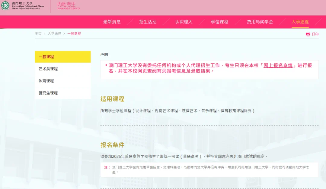 据澳门理工大学官网显示,内地学生想要报读该校,须参加2025年普通高等学校招生全国统一考试(普通高考),并符合国家有关赴澳门就读的规定。不过,澳门理工大学在内地属单独招生,文理科兼收,与报考内地大学并没有冲突。考生既可报考澳门理工大学,同时也可填报内地大学志愿。