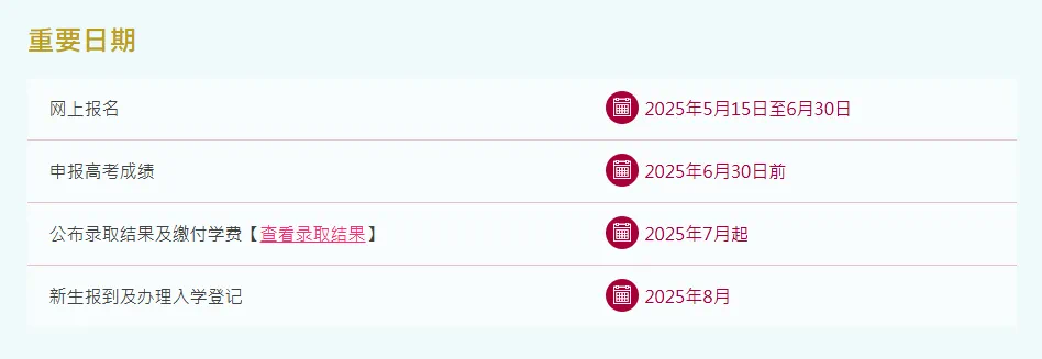 内地考生2025年高考成绩需达到所属省市本科第一批录取分数线 /特殊类型招生控制分数线以上,英语成绩必须达110分以上(150分为满分)。该校将根据内地考生的高考成绩、志愿次序及各课程之收生名额,择优录取,无须面试。录取次序将按填报志愿优先次序进行。